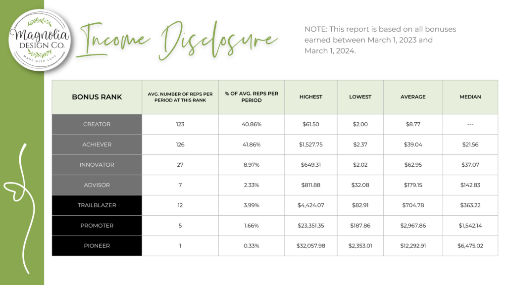 INCOME DISCLAIMER: Magnolia Design Co. does not guarantee that Creators will generate any income. As with any business, each Creators business results may vary based on a number of factors, including individual effort, time and circumstances. For statistics on actual earnings of our Creators, please review the Income Disclosure Statement